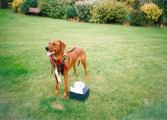 CH Hespa Highlander of Africaner celebrated his 16th birthday on the 15th of October 2014. We believe he is the oldest Champion Ridgeback alive today and one of the longest living pedigree Ridgebacks of all time. He is the great great Grandfather of Tor our current Champion show dog. He is still active and full of life, long may it continue.